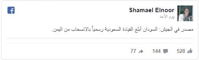 وقال “النور” في تدوينة لها عبر حسابها بموقع التواصل الاجتماعي “فيسبوك” رصدتها “وطن”:” مصدر في الجيش: السودان أبلغ القيادة السعودية رسمياً بالانسحاب من اليمن”.