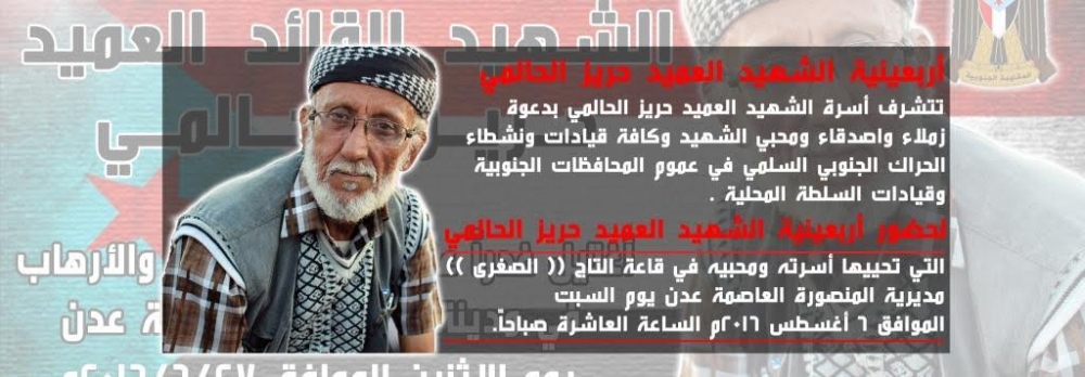 تتشرف أسرة الشهيد العميد حريز الحالمي بدعوة زملاء واصدقاء ومحبي الشهيد وكافة قيادات ونشطاء الحراك الجنوبي السلمي في عموم المحافظات الجنوبية وقيادات السلطة المحلية .