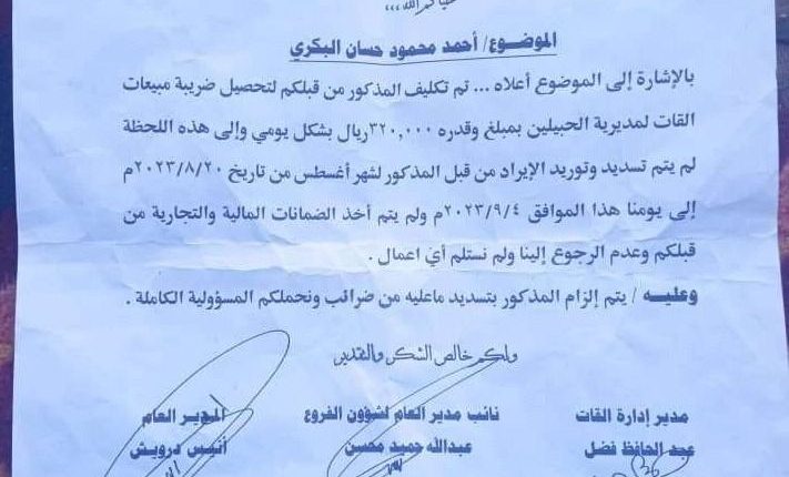 وبحسب الوثيقة ” وعلى لسان ثلاثة من مسئولي الضرائب فإن المسؤول الحالي عن توريد ضرائب القات لم يورد ريالاً منذ نحو عشرين يوماً.