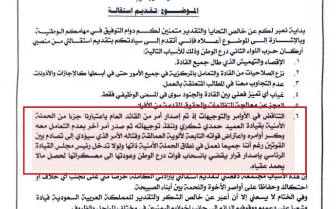 وبحسب الوثيقة، أرجع سرور عبدالله البوكري، أركان اللواء الثاني في “درع الوطن”، أحد أبرز أسباب استقالته التي قدّمها الأسبوع الماضي، إلى ما وصفه بـ “تعليمات سعودية عليا” تقضي بعدم التعامل مع قائد لواء العمالقة التابع للإمارات، حمدي شكري الصبيحي، الذي تنتشر قواته في مديريتي المضاربة ورأس العارة قرب باب المندب.