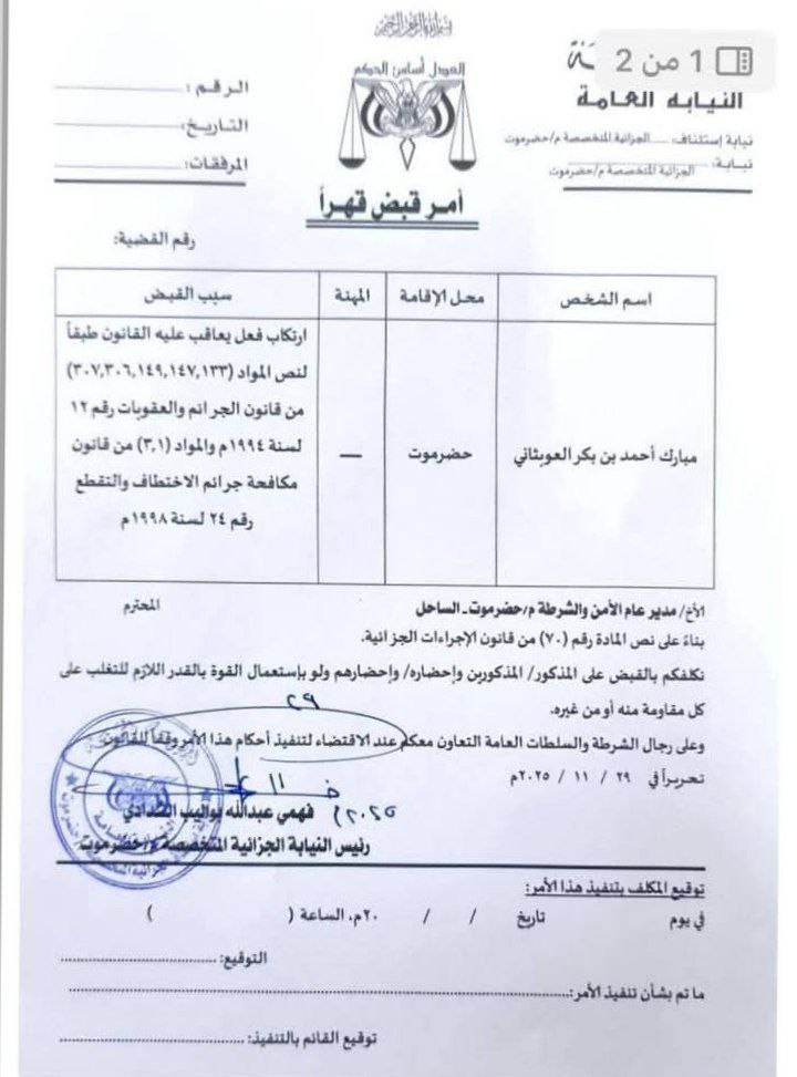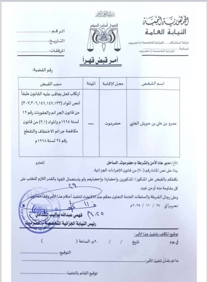 في تطور جديد للصراع بين الفصائل الموالية للسعودية ونظيرتها الإماراتية في حضرموت، صدرت خلال الساعات الماضية أوامر قبض قهرية بحق رئيس حلف قبائل حضرموت الشبخ عمرو بن حبريش، وقائد ما يسمى “قوات حماية حضرموت” مبارك العوبثاني، الموالين للسعودية.